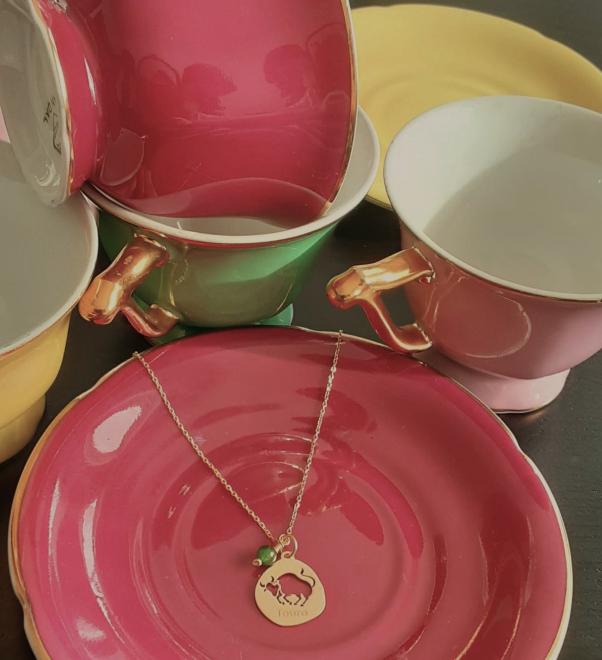 • Colar Signo Touro Prata 925 c/ Banho de Ouro e Pingente Jade Verde